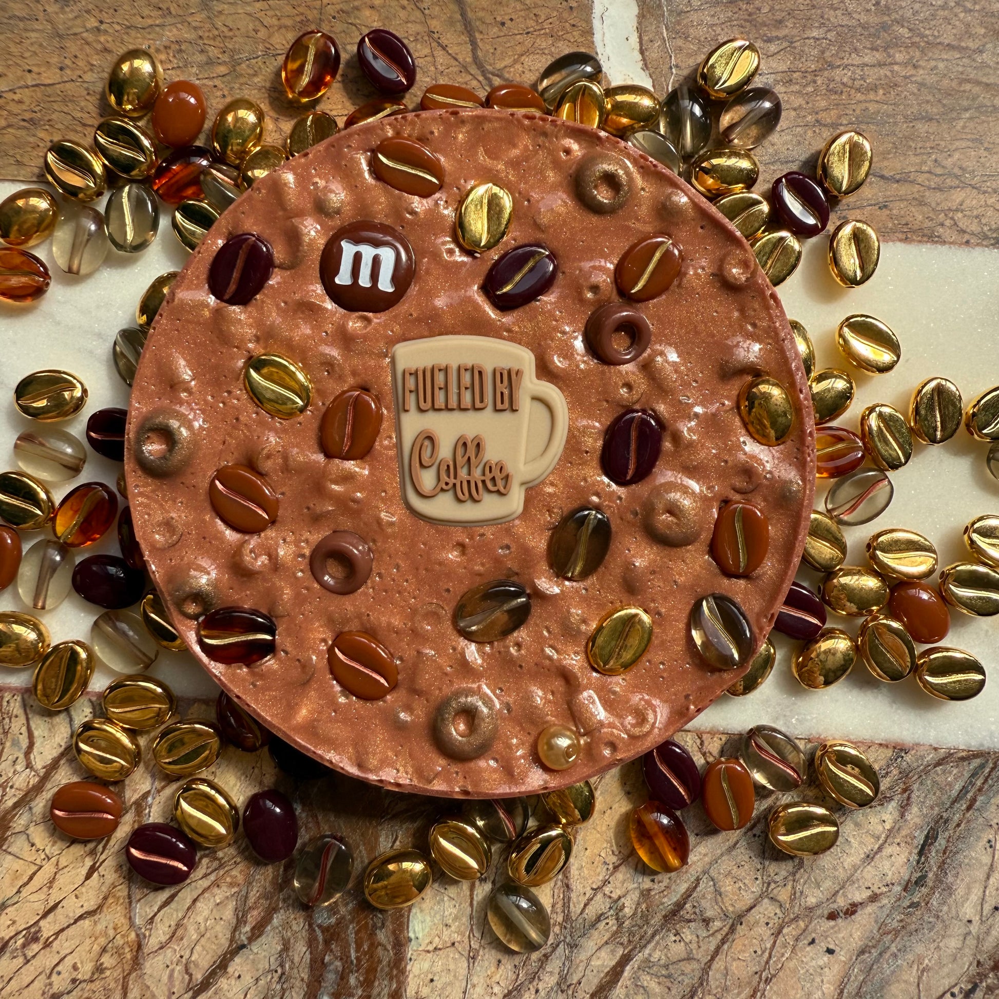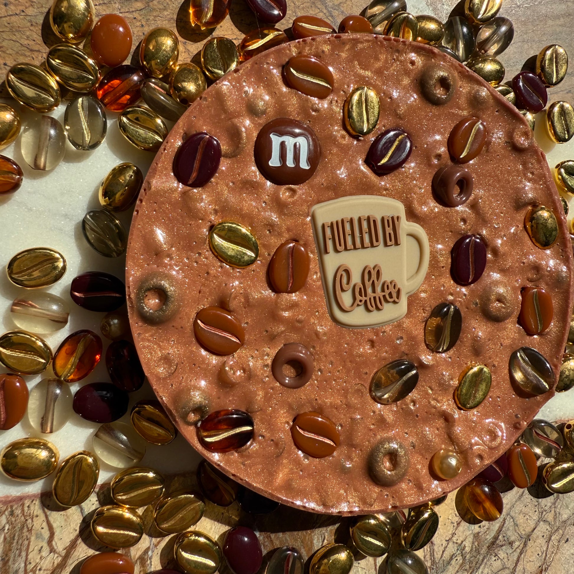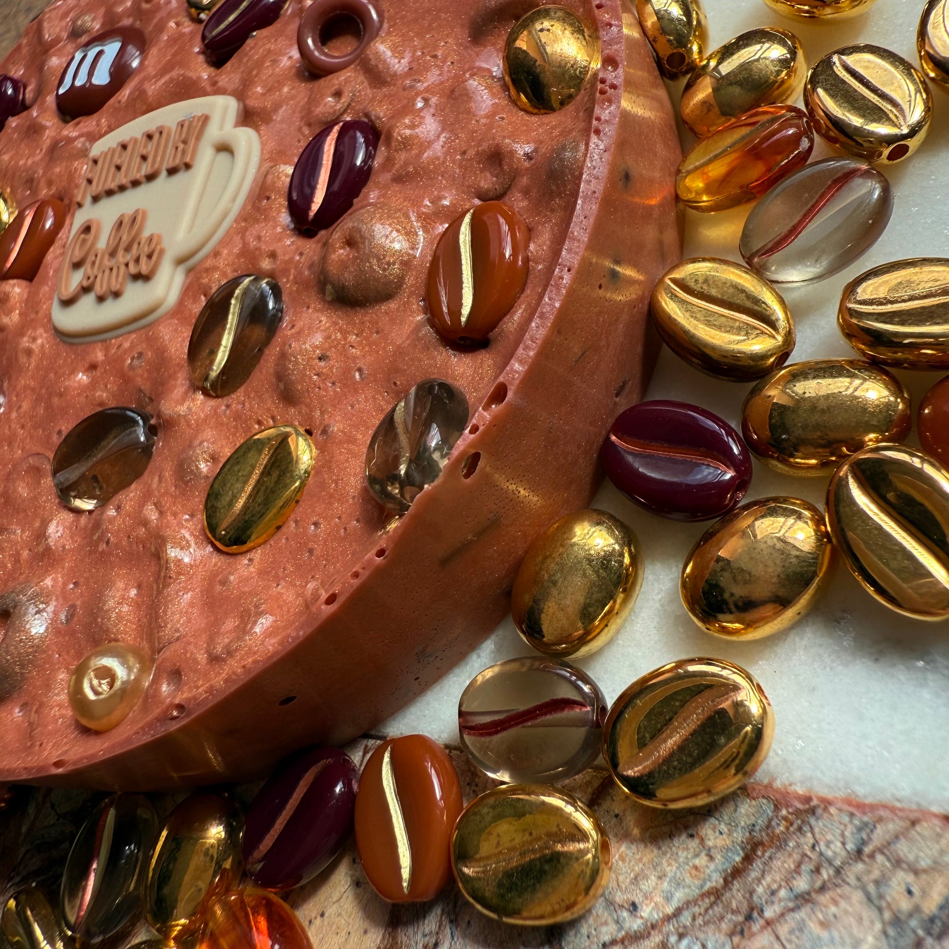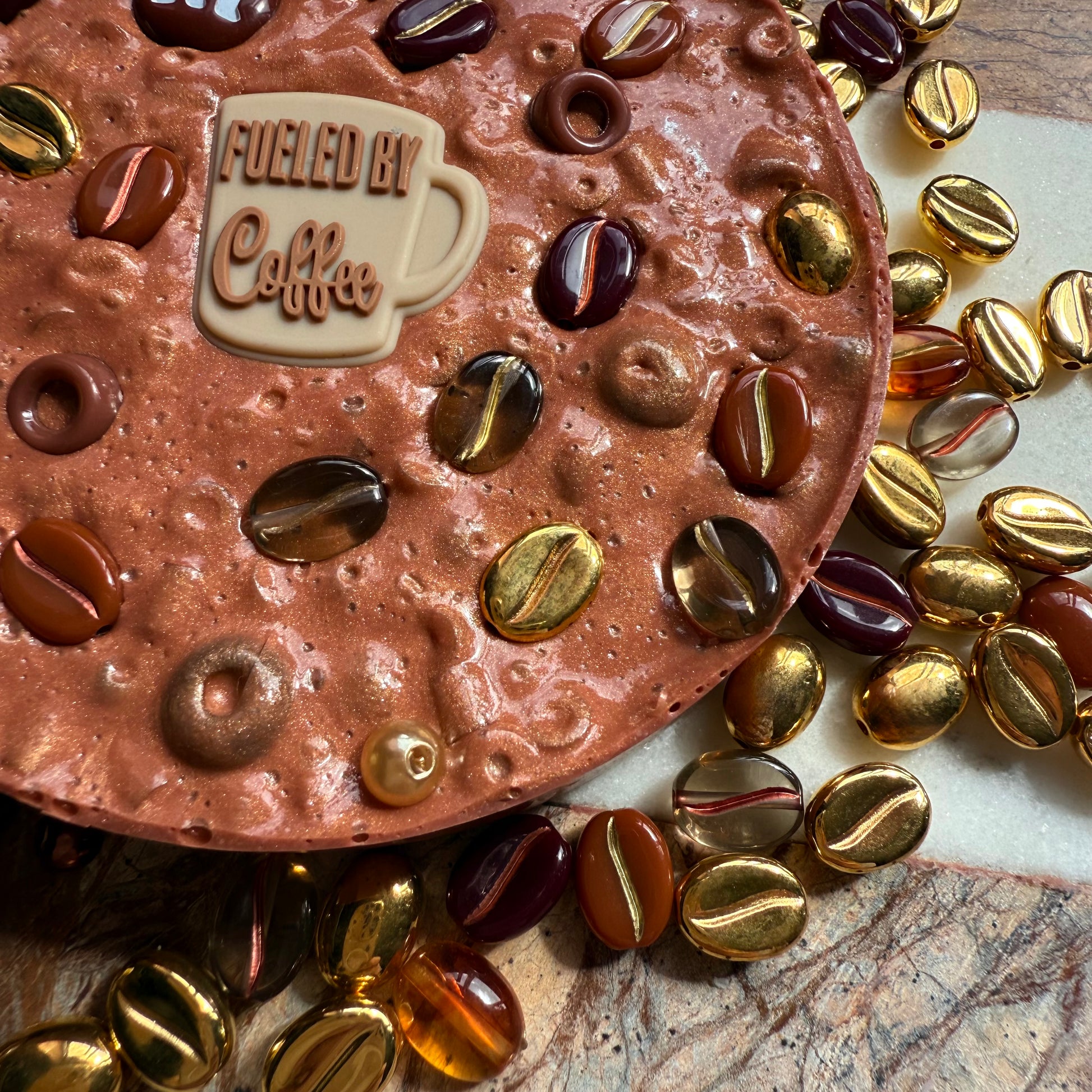 3) This 'ESPRESSO' picky pad is brown (Coffee) in colour with brown beads that vary is shape, size and texture. The top of the pad is decorated with brown beads, espresso beans and a coffee cup.