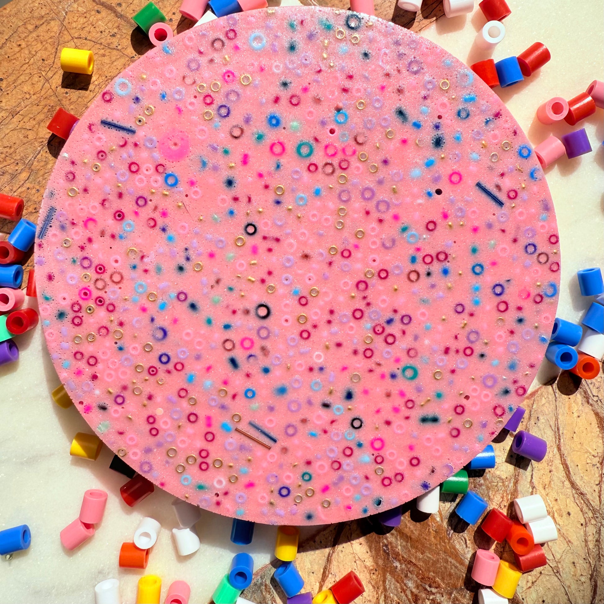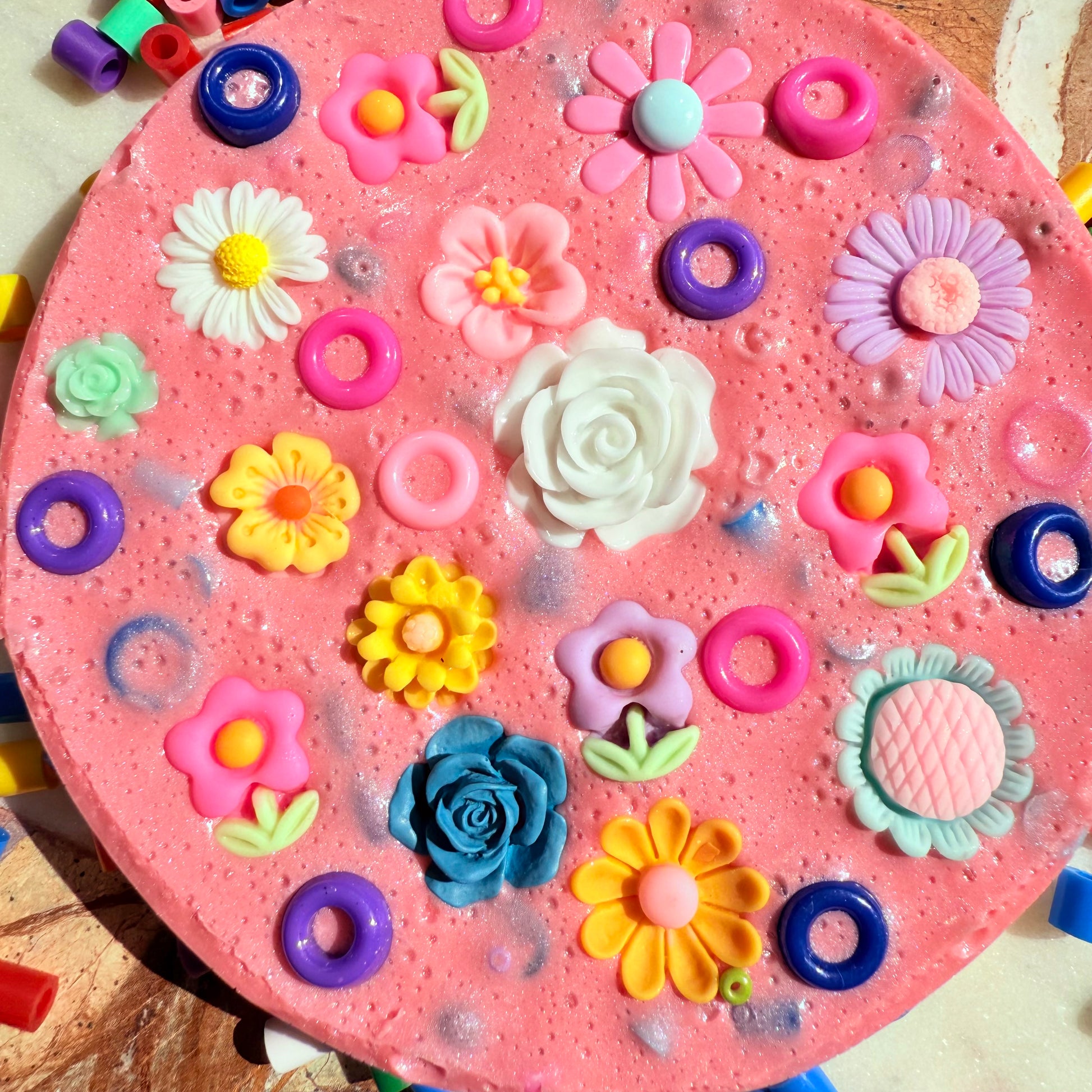 3)This 'FLOWER POWER' picky pad is a pink in colour with pink, blue and purple beads that vary is shape, size and texture. The top of the pad is decorated with beads and flowers.