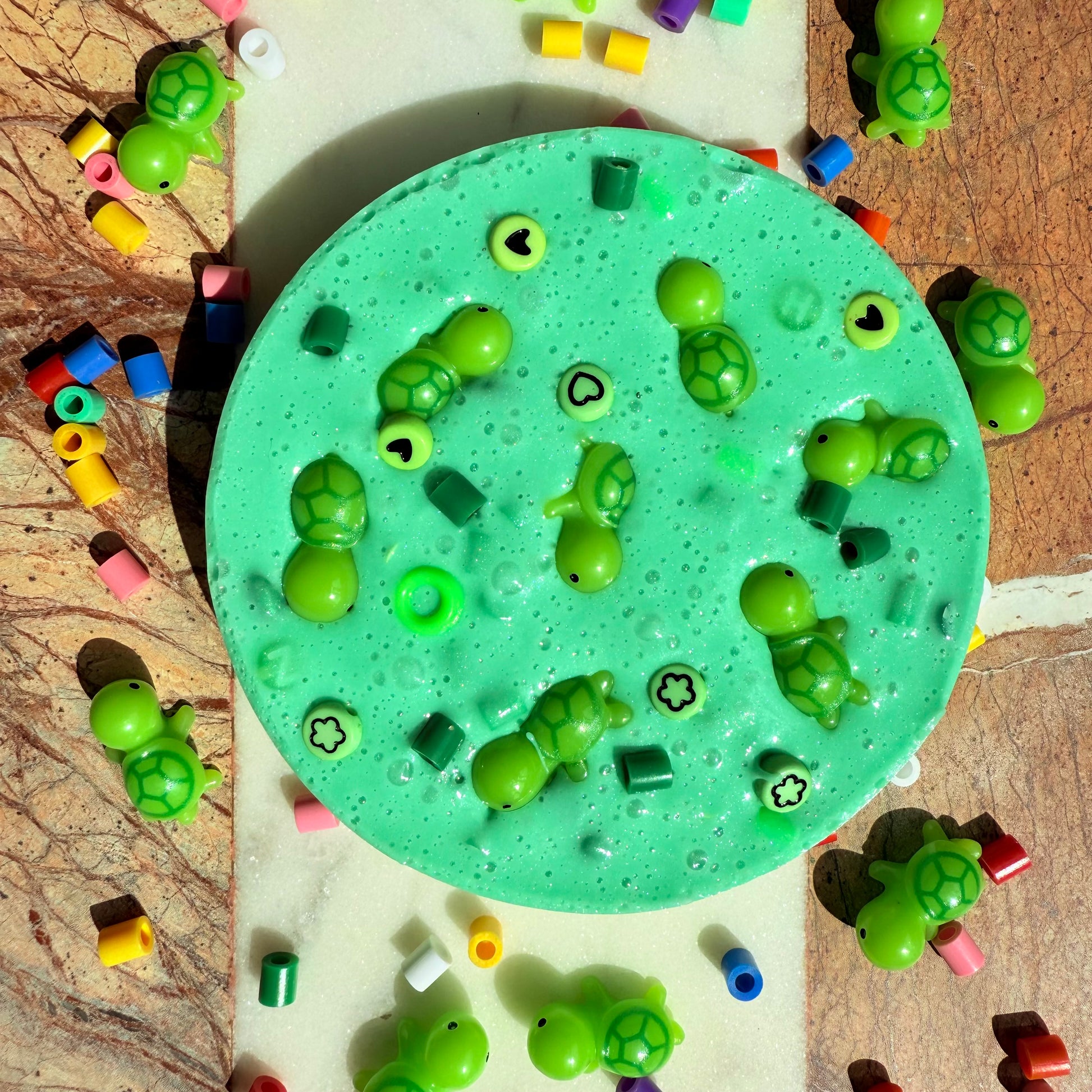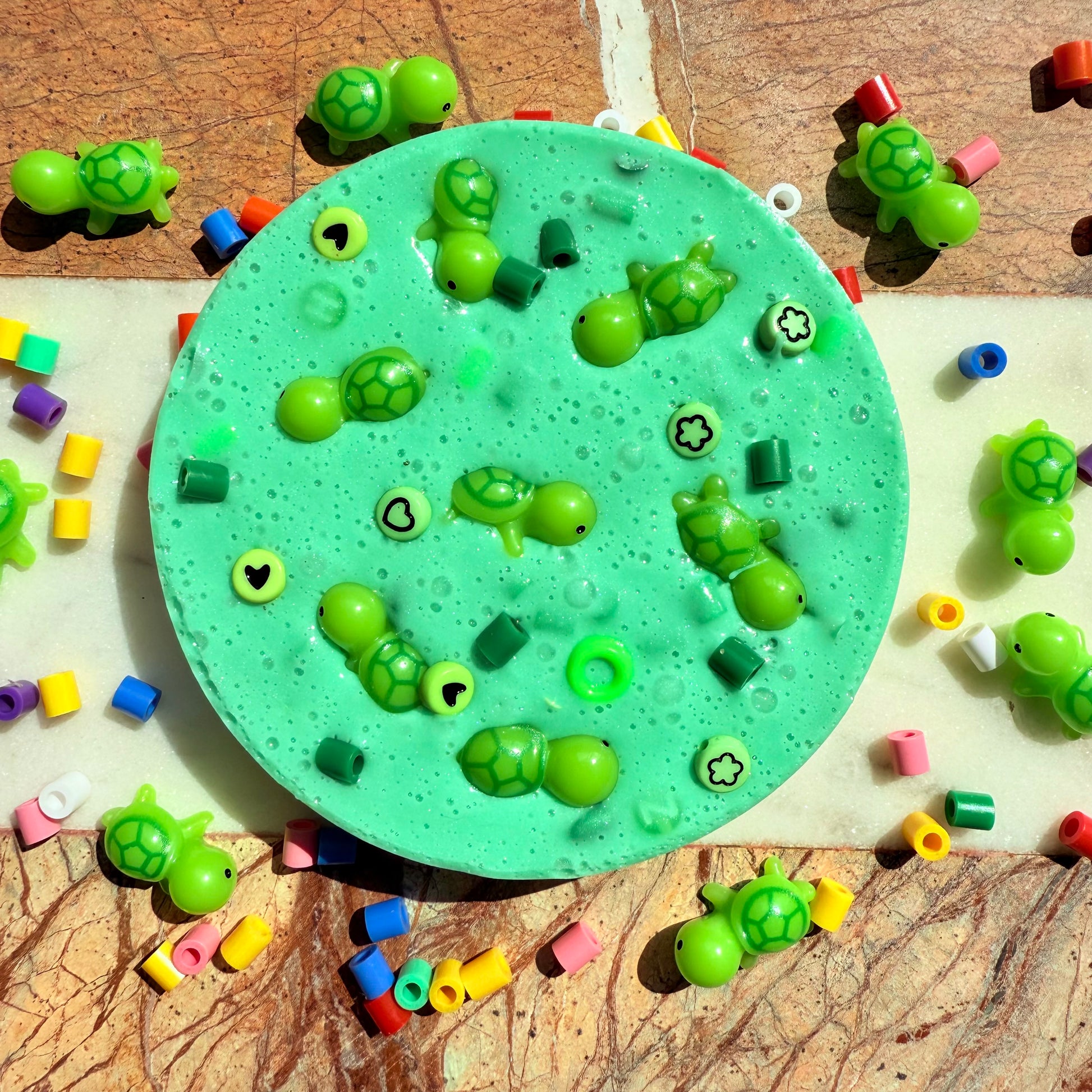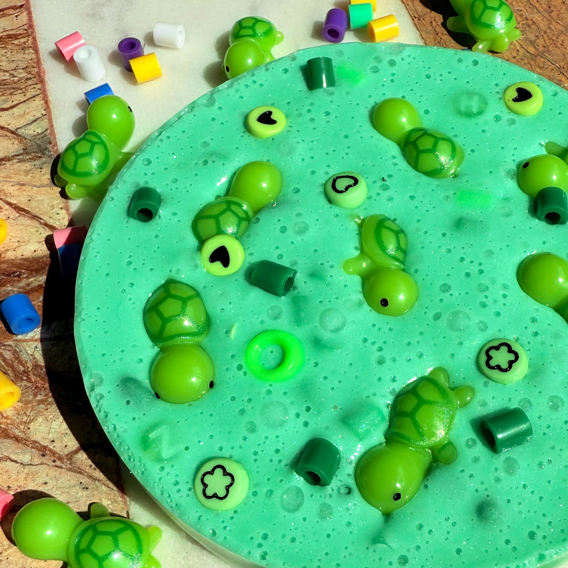 3)This 'TURTLE SOUP' picky pad is a green in colour with green beads that vary is shape, size and texture. The top of the pad is decorated with green beads and green turtles